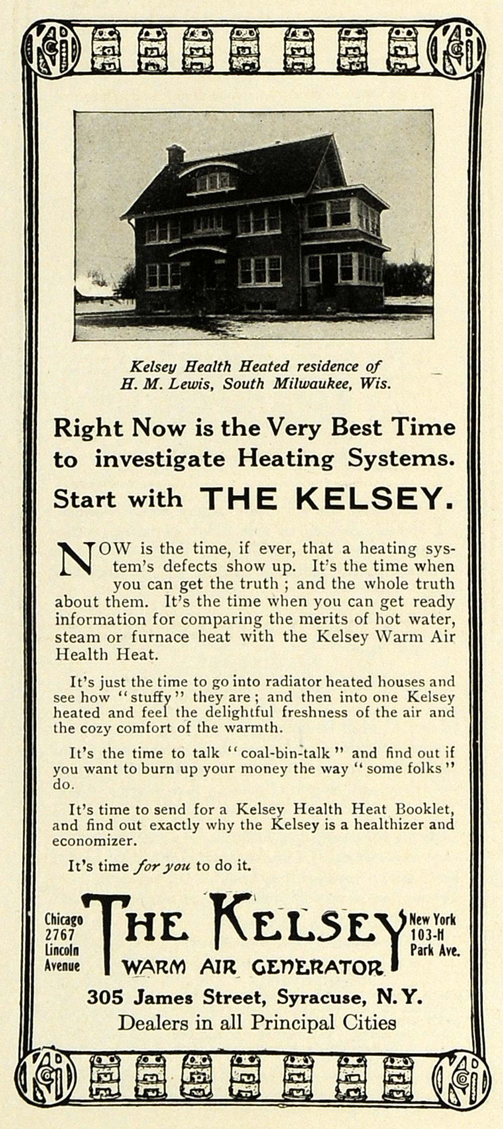This is a small original 1915 black and white print ad for The Kelsey Warm Air Generator, featured in the home of H. M. Lewis in South Milwaukee, Wisconsin.