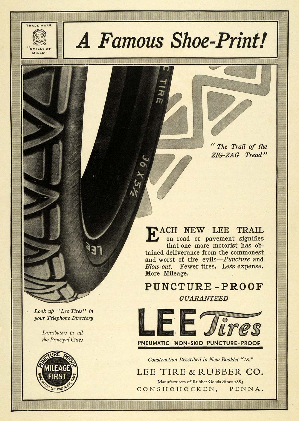 This is an original 1915 black and white print ad for the Lee Tires from Lee Tire & Rubber Company located in Conshohocken, Pennsylvania.