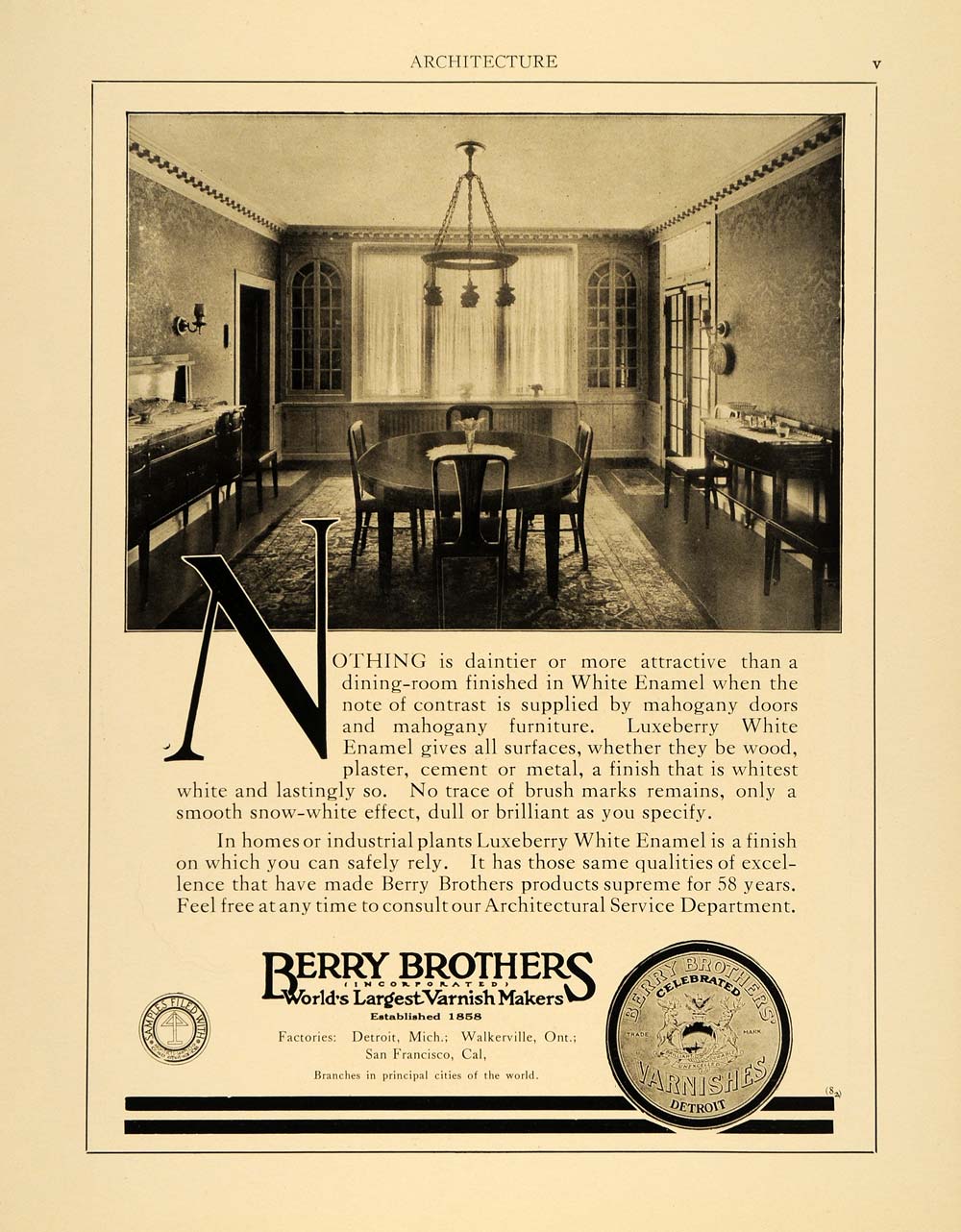 This is an original 1915 black and white print ad for Luxeberry White Enamel by Berry Brothers Incorporated, world's largest varnish makers, established in 1858. There are locations in Detroit, Michigan; Walkerville, Ontario; San Francisco, California.