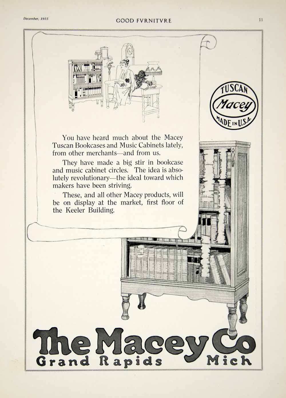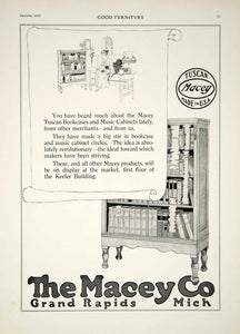 This is an original 1915 black and white print ad for Tuscan bookcases and music cabinets from The Macey Co. of Grand Rapids, Michigan.