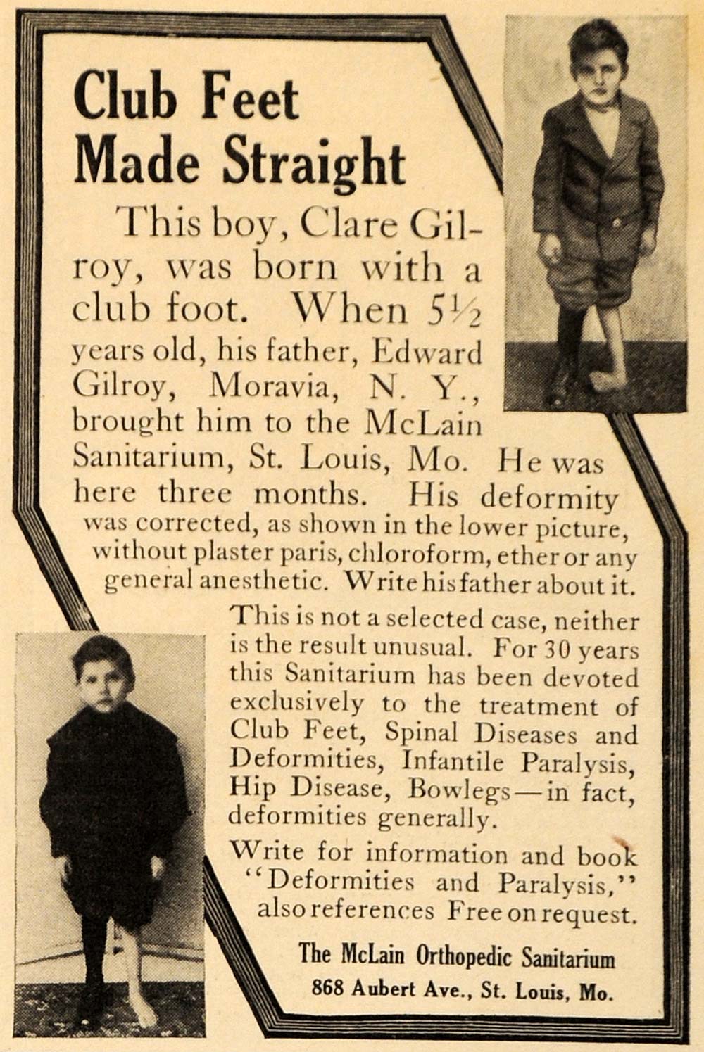 This is an original 1915 black and white print ad for the McLain Orthopedic Sanitarium treating club feet, spinal diseases, deformities, infantile paralysis, hip disease without plaster paris, chloroform, or any general anesthetic located at 868 Aubert Avenue, Saint Louis, Missouri.