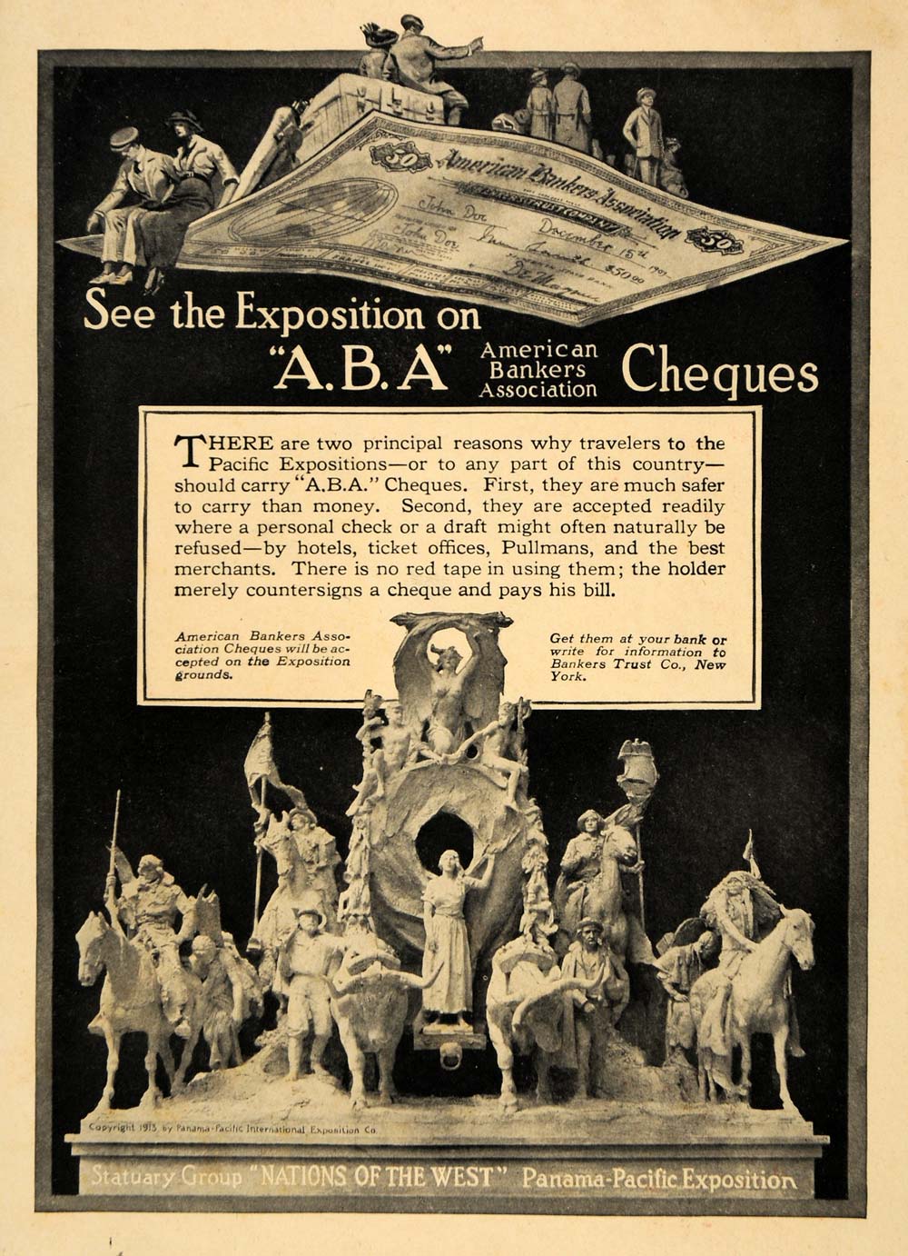 This is an original 1915 black and white print ad for the American Bankers Association. The ad features an image of the sculpture "Nations of the West" featured at the 1915 Panama-Pacific Exposition. The scupture was created by A. Sterling Calder, Leo Lentelli, and Roth. The sculpture features images of pioneers and Native Americans.