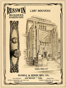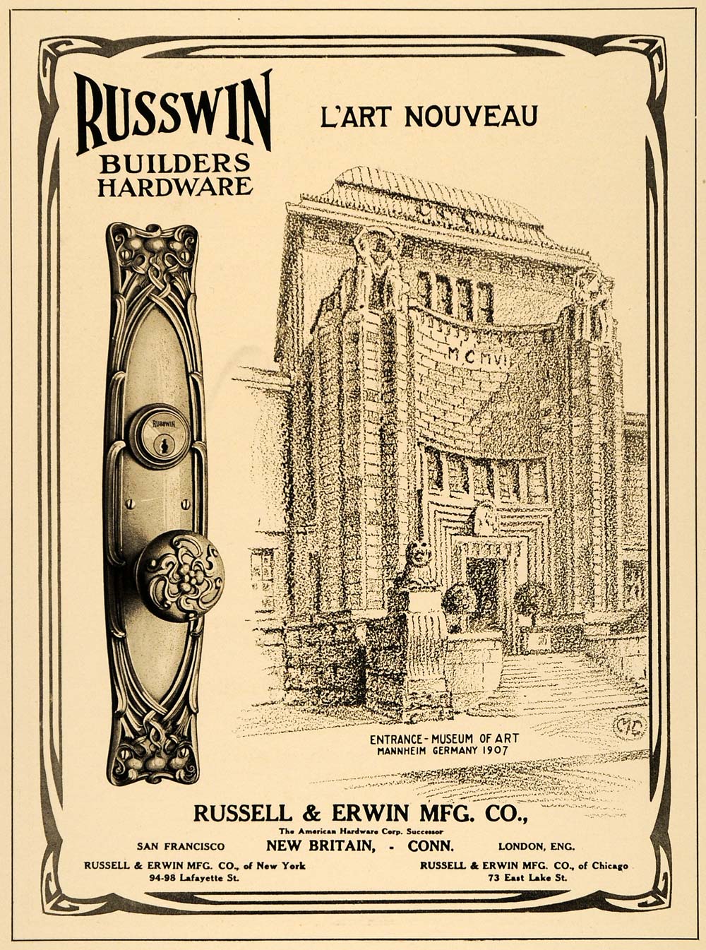 This is an original 1915 black and white print ad for the Russell & Erwin Manufacturing Company, located at 94 - 98 Lafayette Street in New York and 73 East Lake Street in Chicago, as well as San Francisco, New Britain (Connecticut), and London. This ad features their Russwin L'Art Nouveau Builders Hardware, including lovely and ornate doorknobs. The illustration is of the entrance to the Museum of Art in Mannheim, Germany, in 1907, done by an unidentifiable artist.