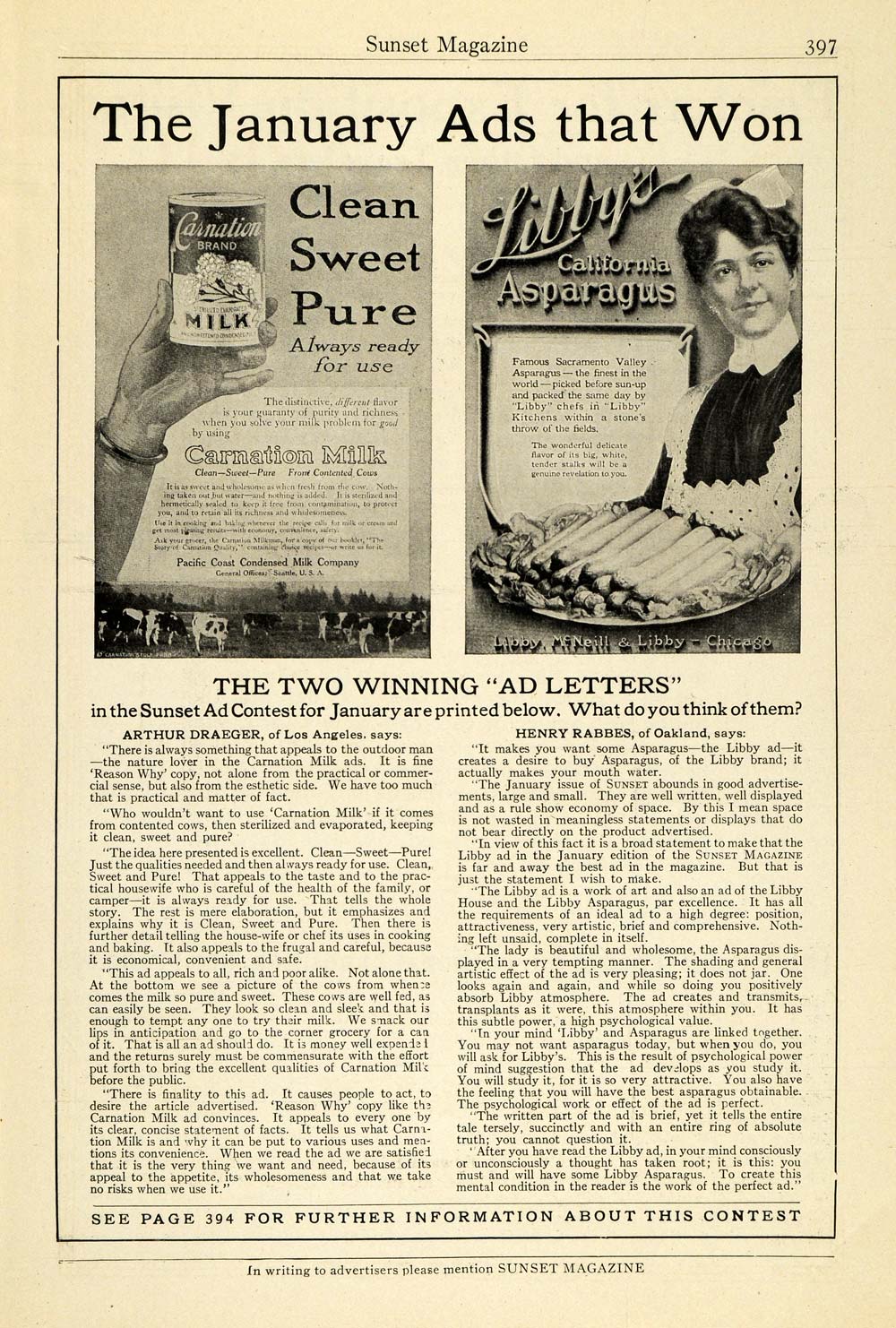 This is an original 1915 black and white print ad for the winners of the Sunset Magazine Ad Contest, which include Henry Rabbes of Oakland for Libby's California Asparagus and Arthur Draeger of Los Angeles for Carnation Brand Milk from the Pacific Coast Condensed Milk Company in Seattle, Washington.