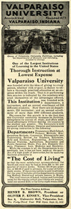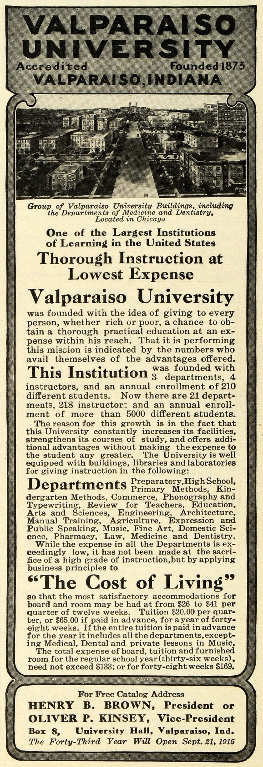 This is an original 1915 black and white print ad for Valparaiso University of Indiana. This ad has a photograph of the Departments of Medicine and Dentistry located in Chicago. Board, tuition and furnished room for less than $133!