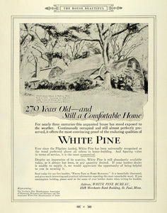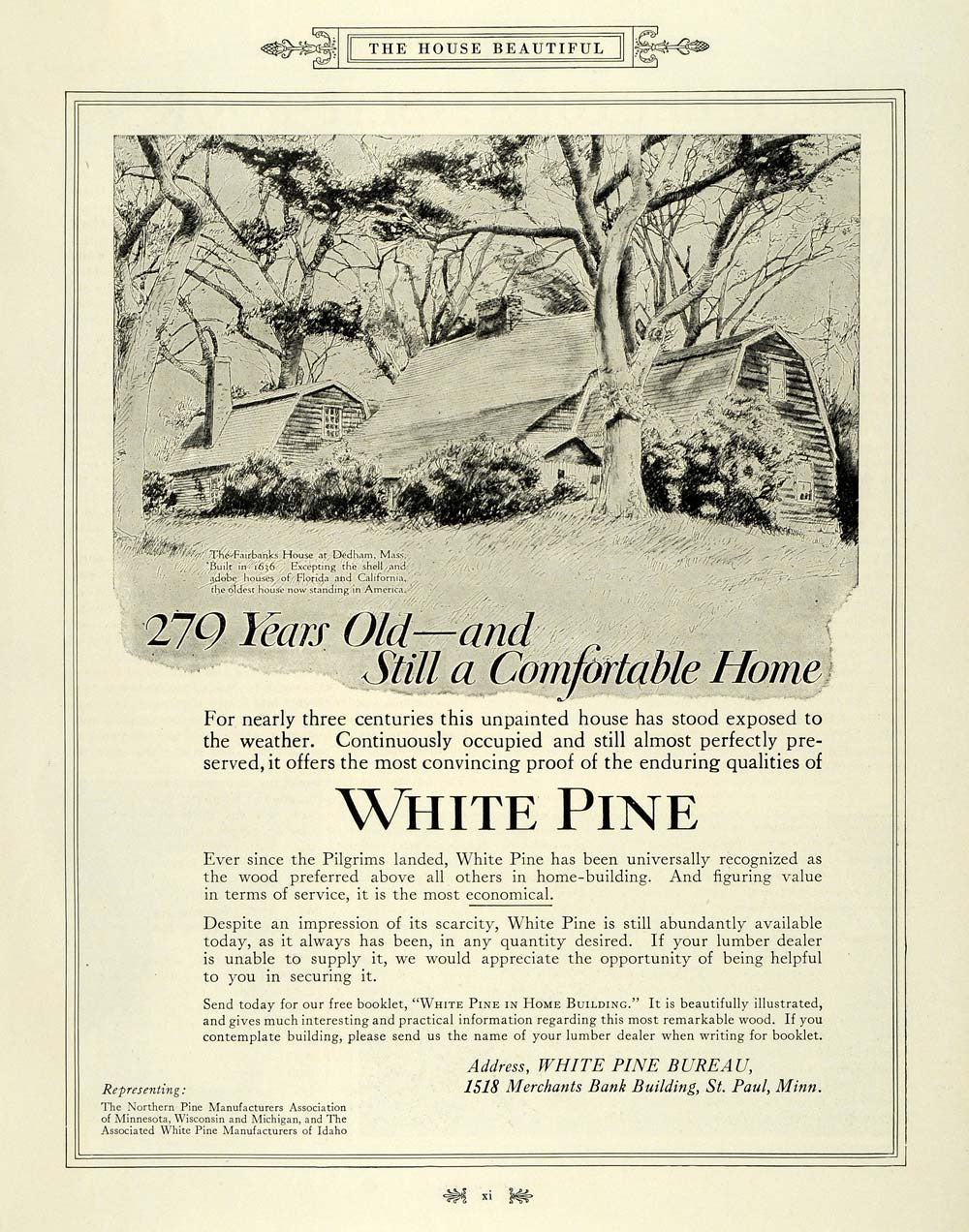 This is an original 1915 black and white print ad for White Pine wood, the preferred wood material in home-building. This particular ad features the Fairbanks House in Dedham, Massachusetts, which was built in 1636.