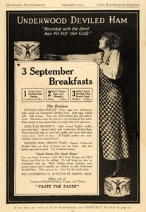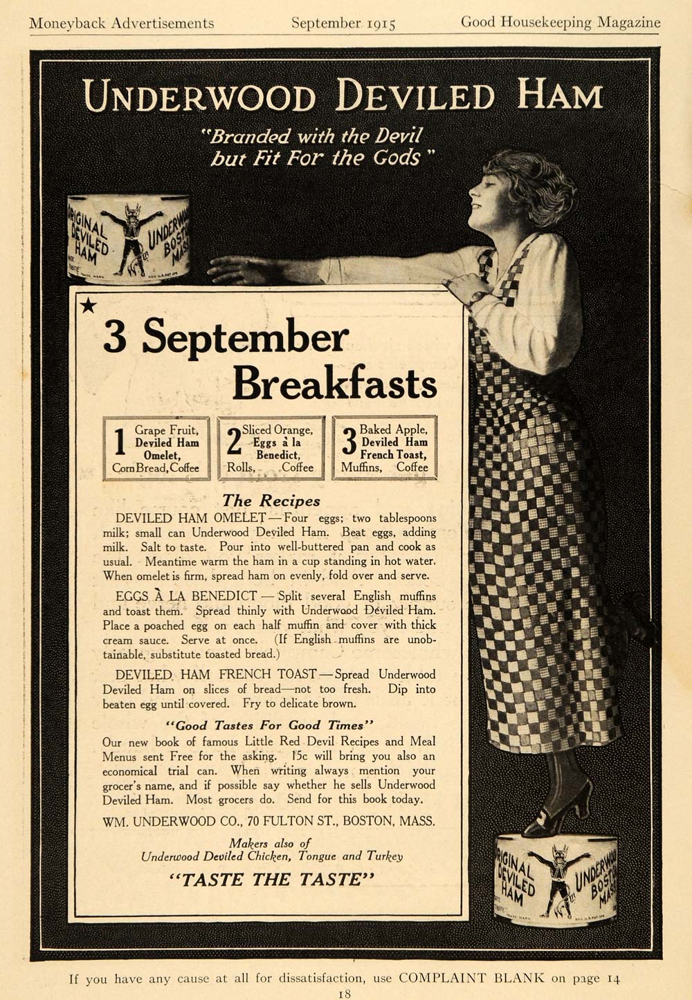 This is an original 1915 black and white print ad for the Underwood Deviled Ham from Wm. Underwood Company located at 70 Fulton Street, Boston, Massachusetts.