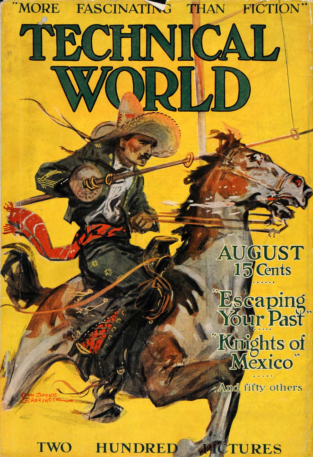 This is an original 1915 color cover for the August issue of Technical World, specially featuring Knights of Mexico with artwork by Dan Sayre Groesbeck.CONDITION