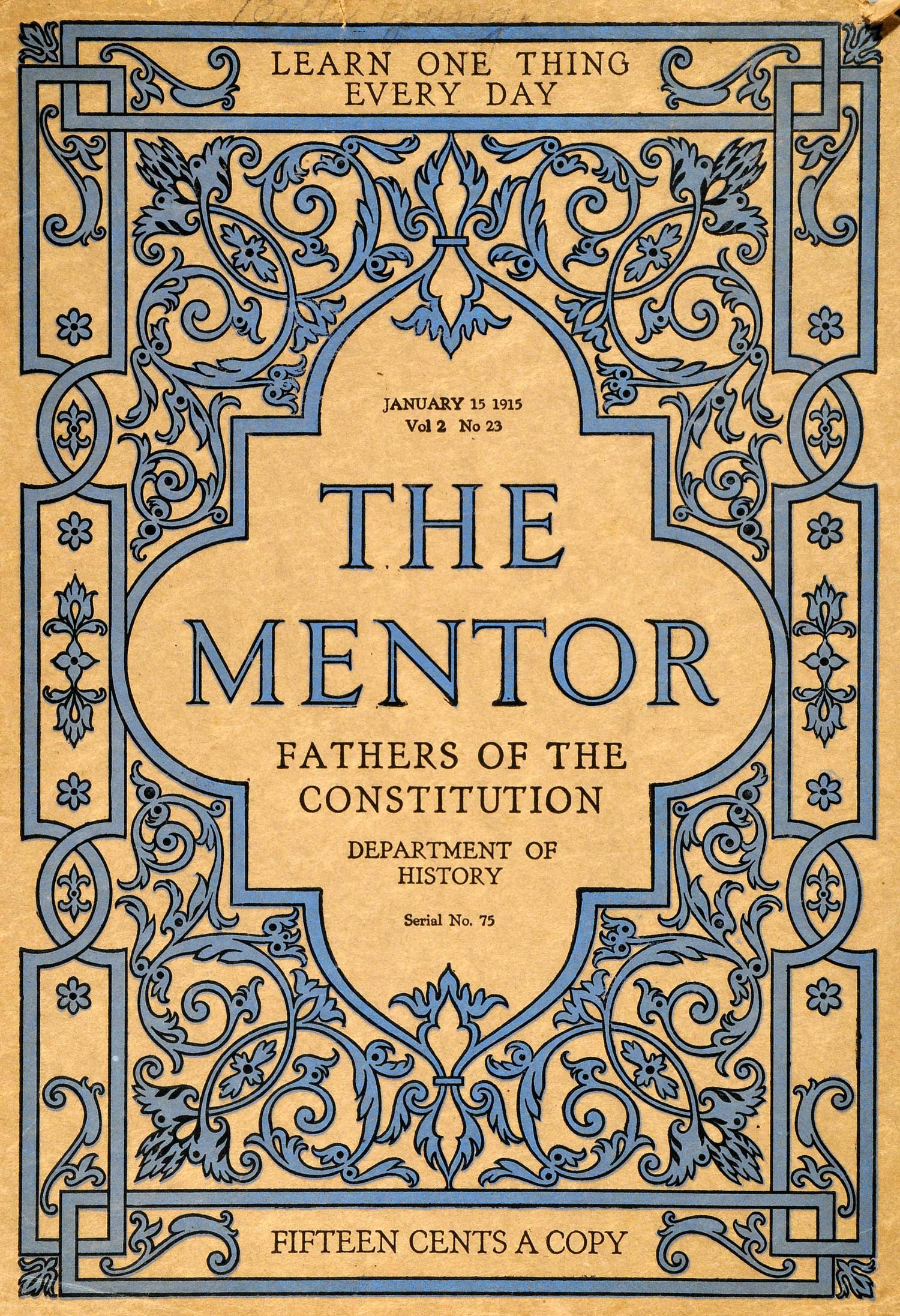 This is an original one-color lithograph cover of The Mentor, January 15, 1915, VOL. 2, No. 23. This issue focused on the Fathers of the Constitution.