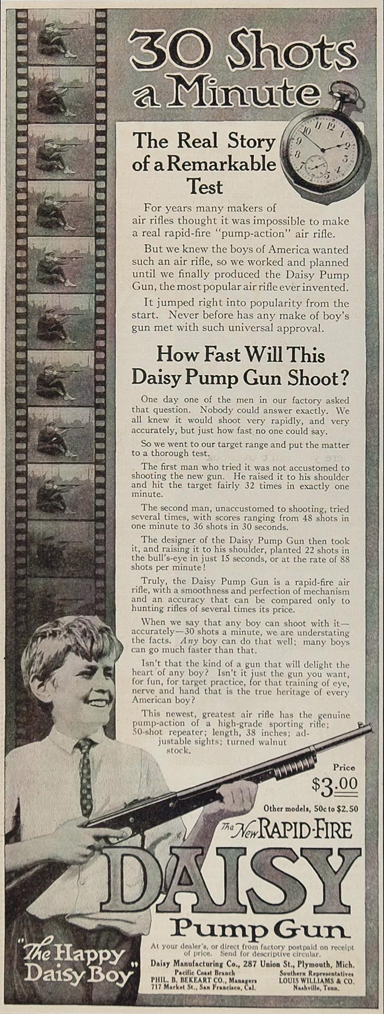 This is an original 1915 black and white print ad for the Rapid-Fire Daisy Pump Gun from the Daisy Manufacturing Co., 287 Union St., Plymouth, Michigan.
