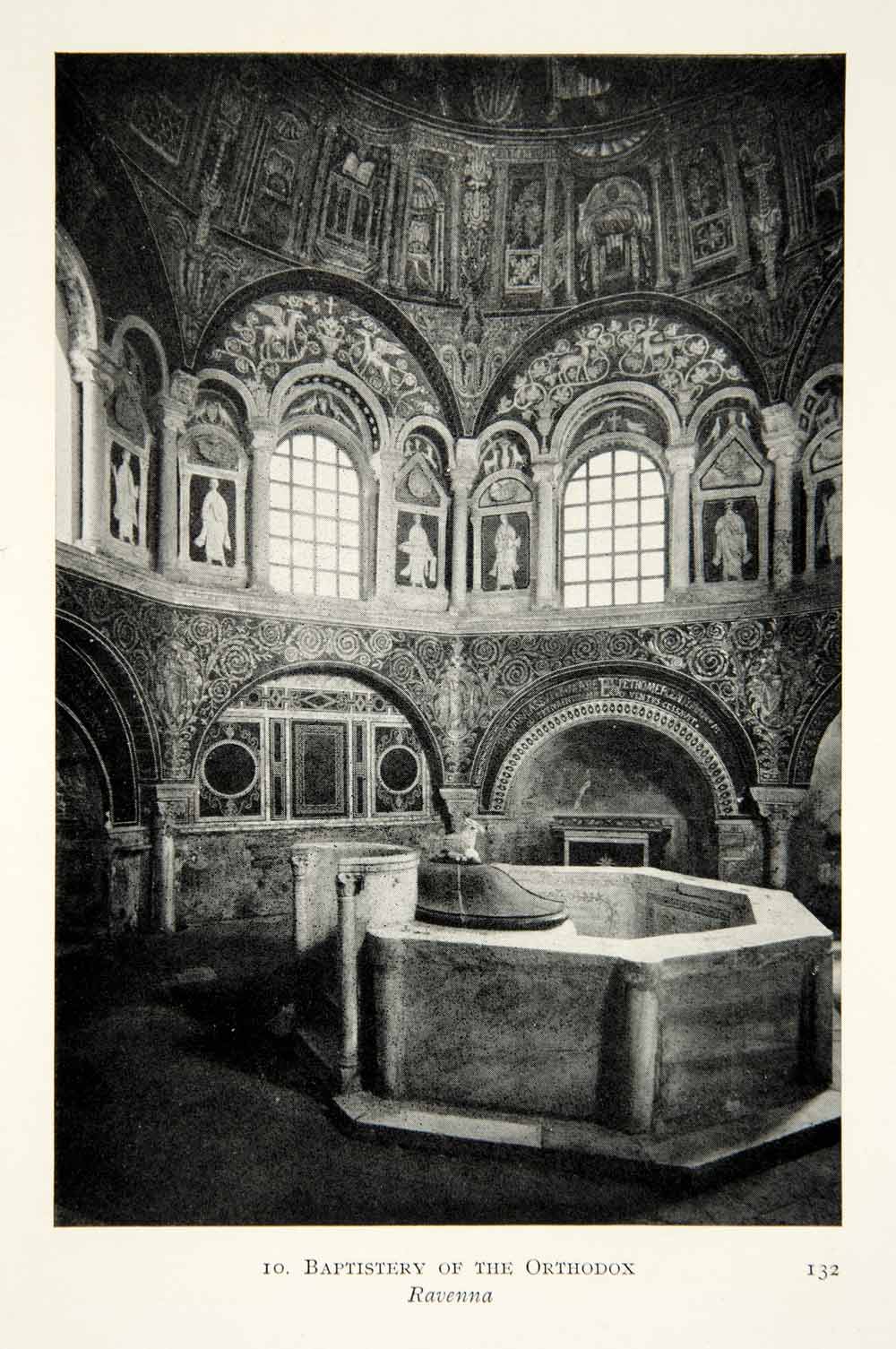 This is an original 1915 black and white halftone print of the Baptistery of Neon also called the Baptistery of the Orthodox in Ravenna, Italy.