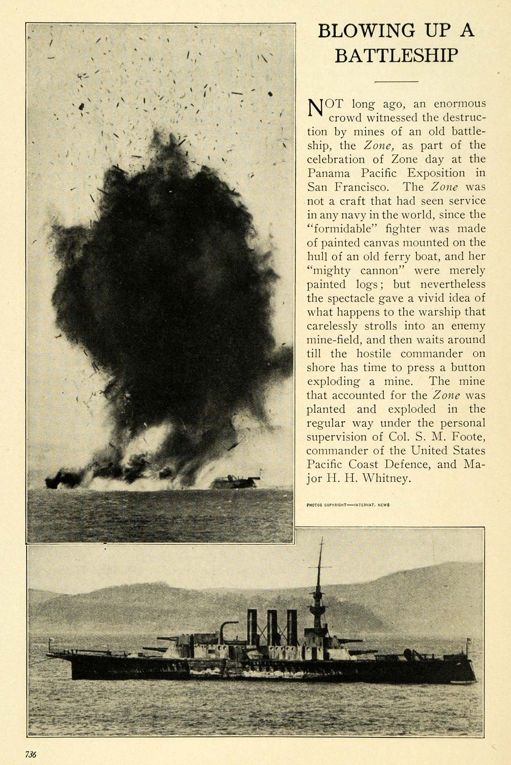 Zone. The ship was blown up for the Panama Pacific Exposition held in San Francisco. The caption writes, "...[the Zone] gave a vivid idea of what happens to the warship that carelessly strolls into an enemy mine-field, and hten waits around till the hostile commander on shore has time to press a button exploding the mine..."