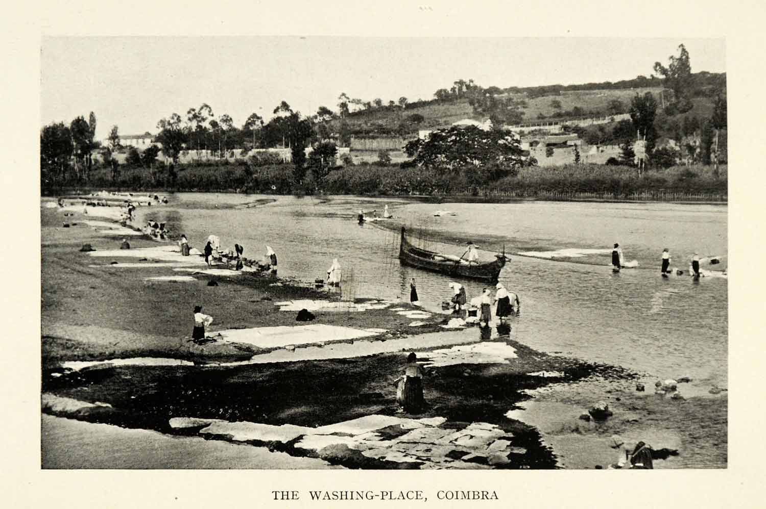 This is an original 1915 halftone print of the "washing place" or laundry area in Coimbra, Portugal.