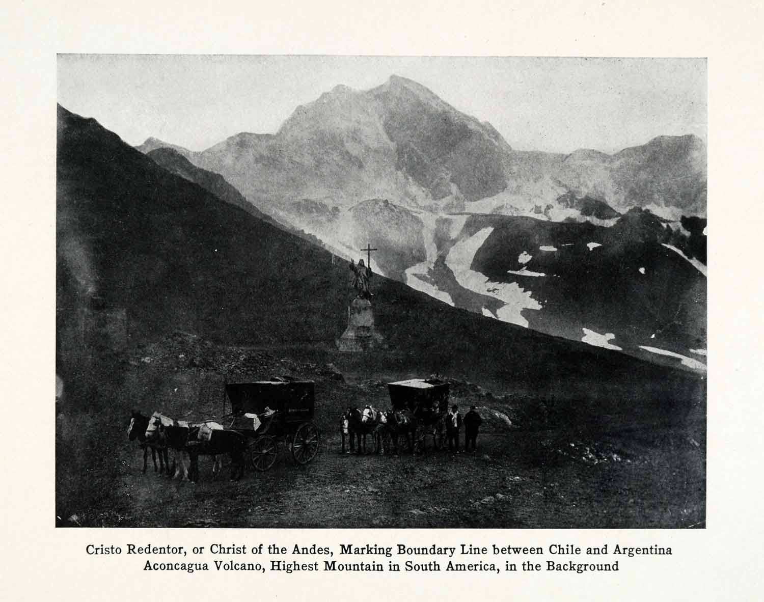 This is an original 1915 halftone print featuring a view of the Christ the Redeemer of the Andes, a monument in the Andes located on the border of Chile and Argentina. This print also shows the Aconcagua Volcano, the highest mountain in the Americas, in the background.