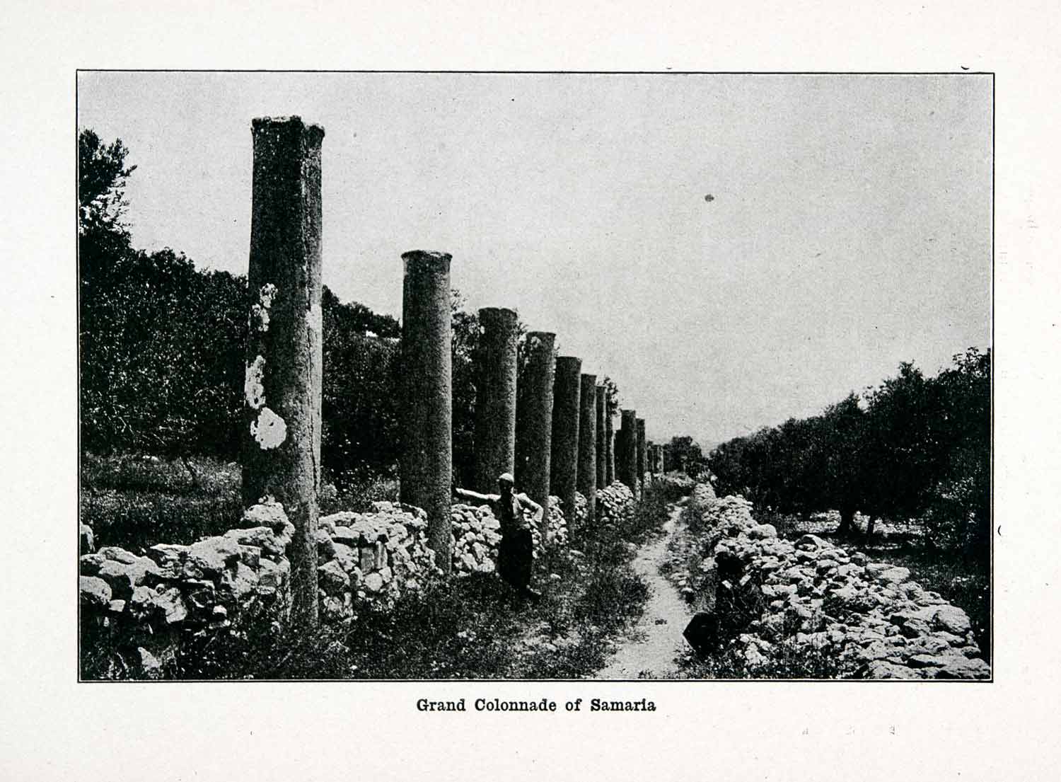 This is an original 1915 black and white halftone print of the Grand Colonnade in Samaria, in the Middle East.
