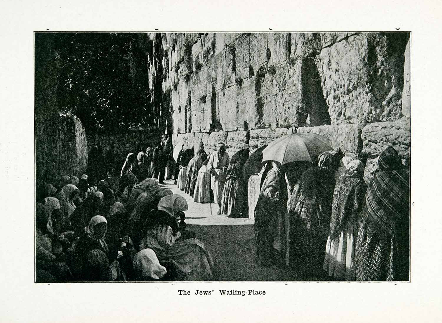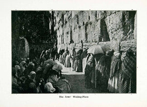 This is an original 1915 black and white halftone print of Jews visiting the Western (Wailing) Wall in the Old City of Jerusalem, Israel, a common site of pilgrimage and prayer.