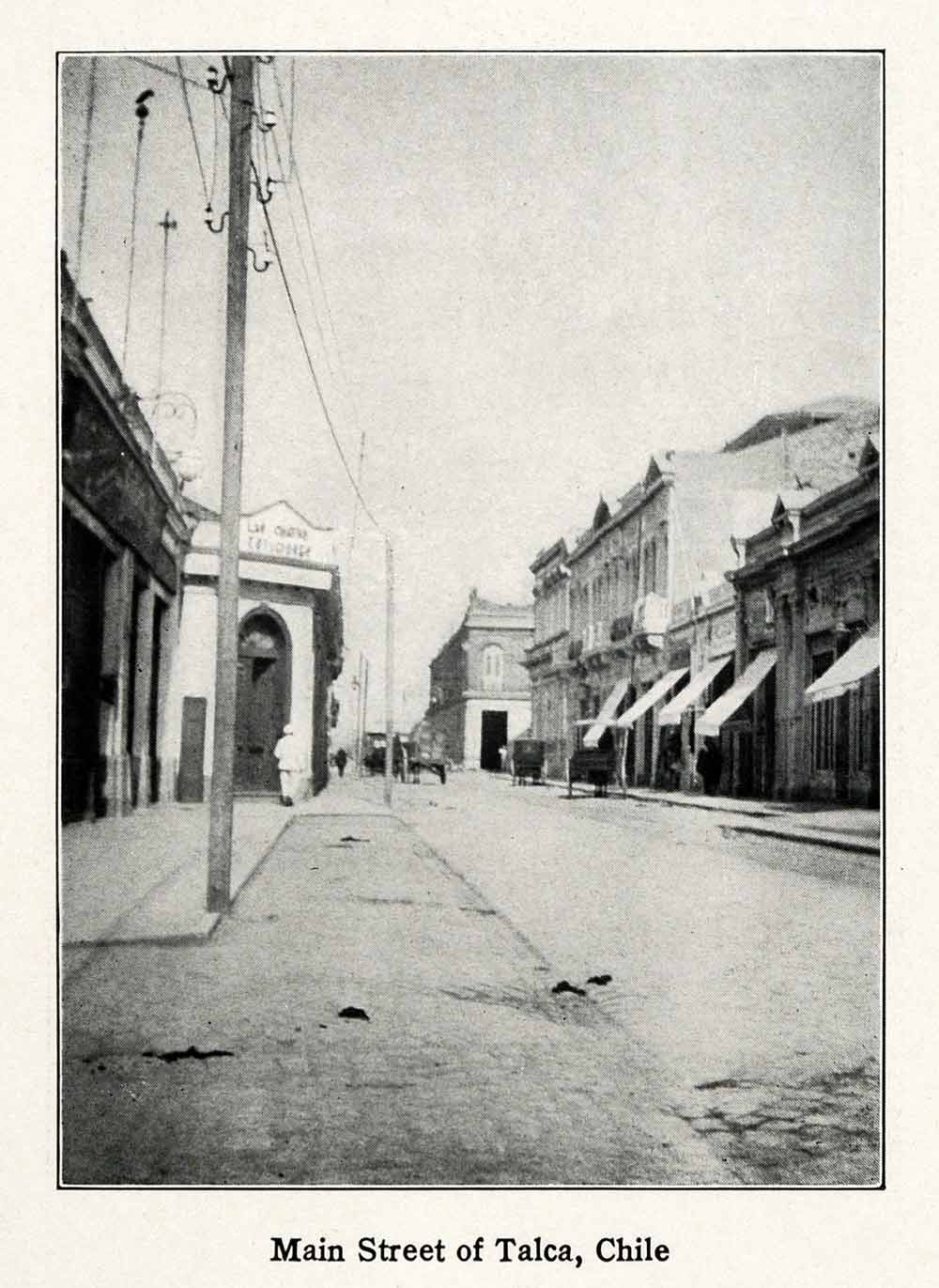 This is an original 1915 halftone print featuring a scene of the main street of the city of Talca located in the Province of Talca and the Maule Region in Chile.
