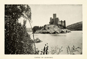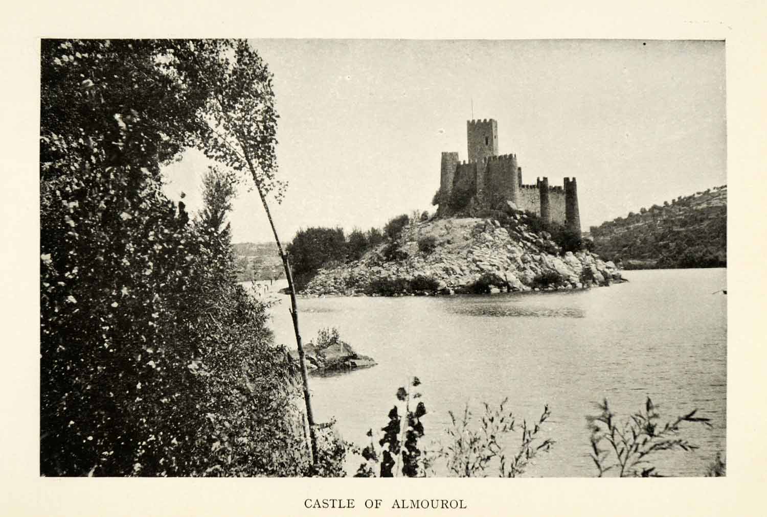 This is an original 1915 halftone print of the medieval Castle of Almourol on the Tagus River in Portugal. At one time, this castle was held by the Knights Templar. In the middle ages, it served as a fortress during the Portuguese Reconquista.