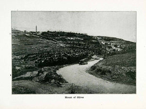 This is an original 1915 black and white halftone print of the Mount of Olives, a place often mentioned in the Holy Bible, located in Jerusalem, Israel.
