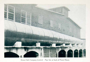 This is an original 1915 duotone halftone print of the pipe line and power house in Ocean Falls, British Columbia, Canada. Ocean Falls used to be a company town with its residents working in the pulp and paper mill.