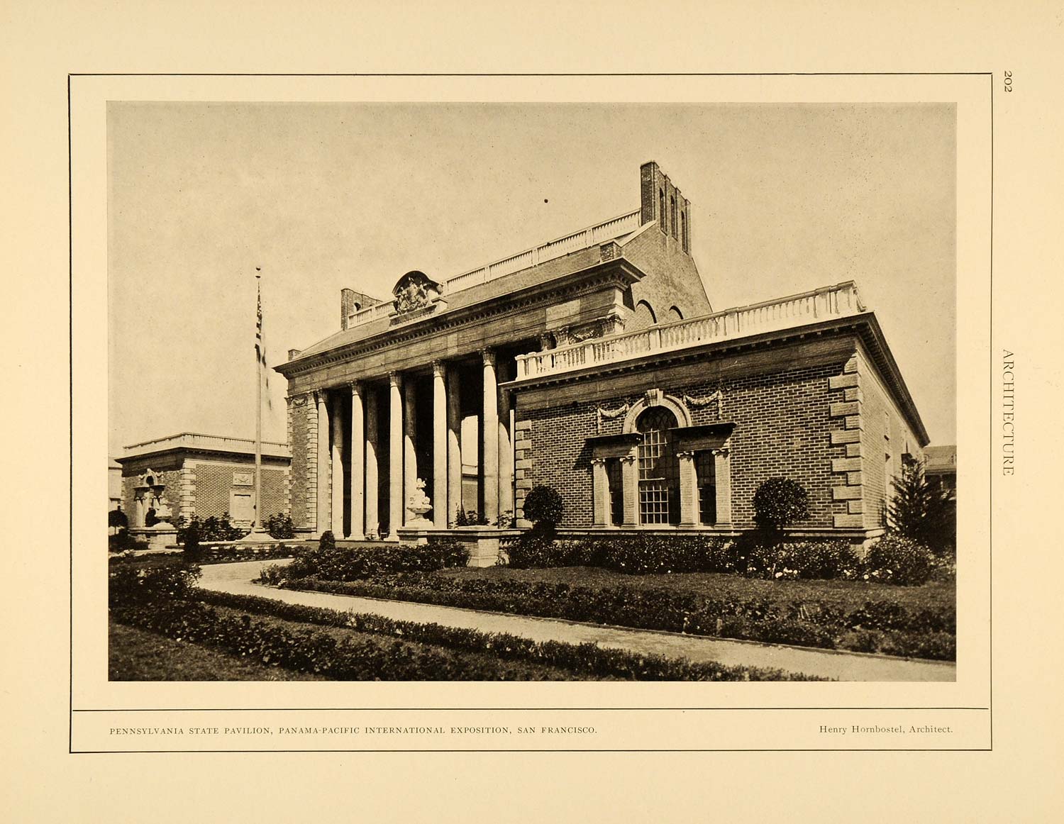 This is an original 1915 halftone print featuring an image of the Pennsylvania State Pavilion, featured at the Panama-Pacific International Exposition in San Francisco. This building was designed by architect Henry Hornbostel.