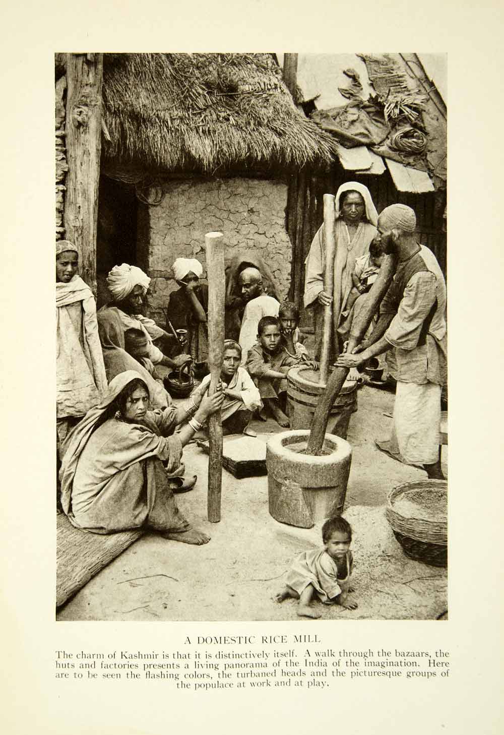 This is an original 1915 sepia halftone print that depicts Indians from the Valley of Kashmir grinding rice into flour by hand.