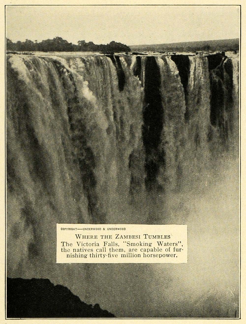 This is an original 1915 halftone print of the Victoria Falls of the Zabesi in South Central Africa. At the time it was estimated that the falls were capable of producing 35 million horsepower.