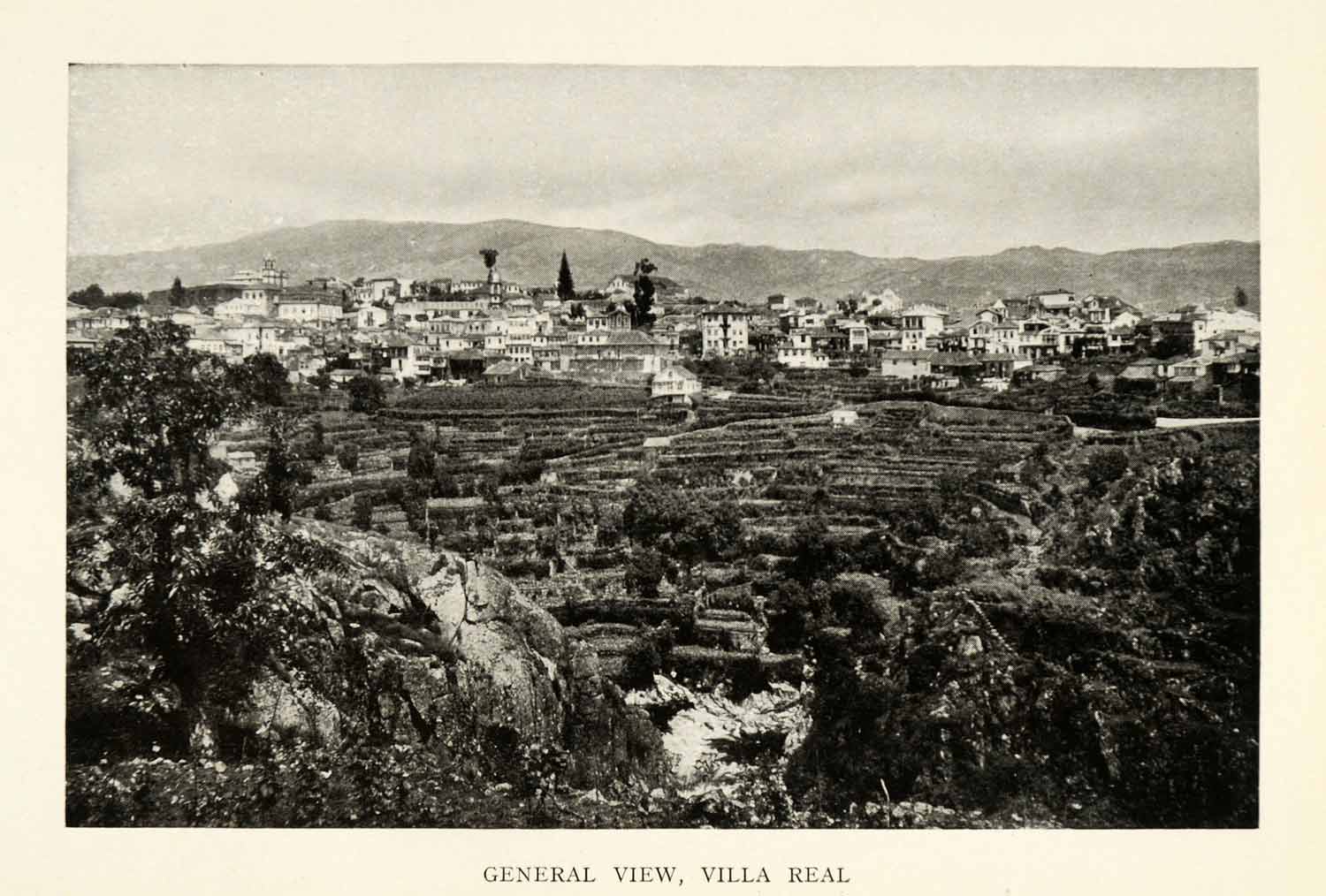 This is an original 1915 halftone print of a bird's eye view of Vila Real in Portugal.
