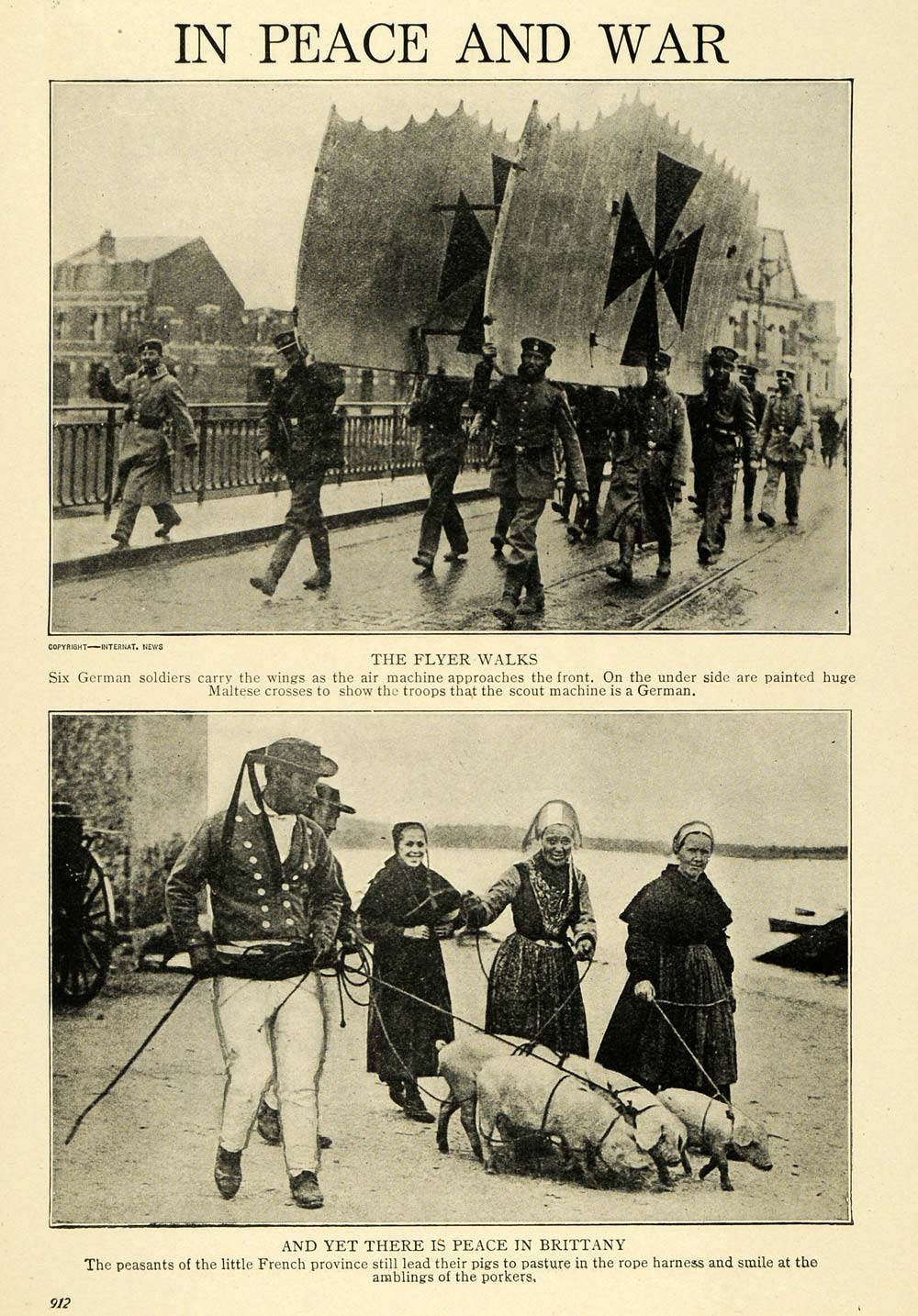 This is an original 1915 halftone print of German soldiers carrying the wings of an air machine, which are painted with Maltese crosses to signify that the scout machine is German. The second image shows peasants of Brittany leading their pigs via rope harness to pasture.