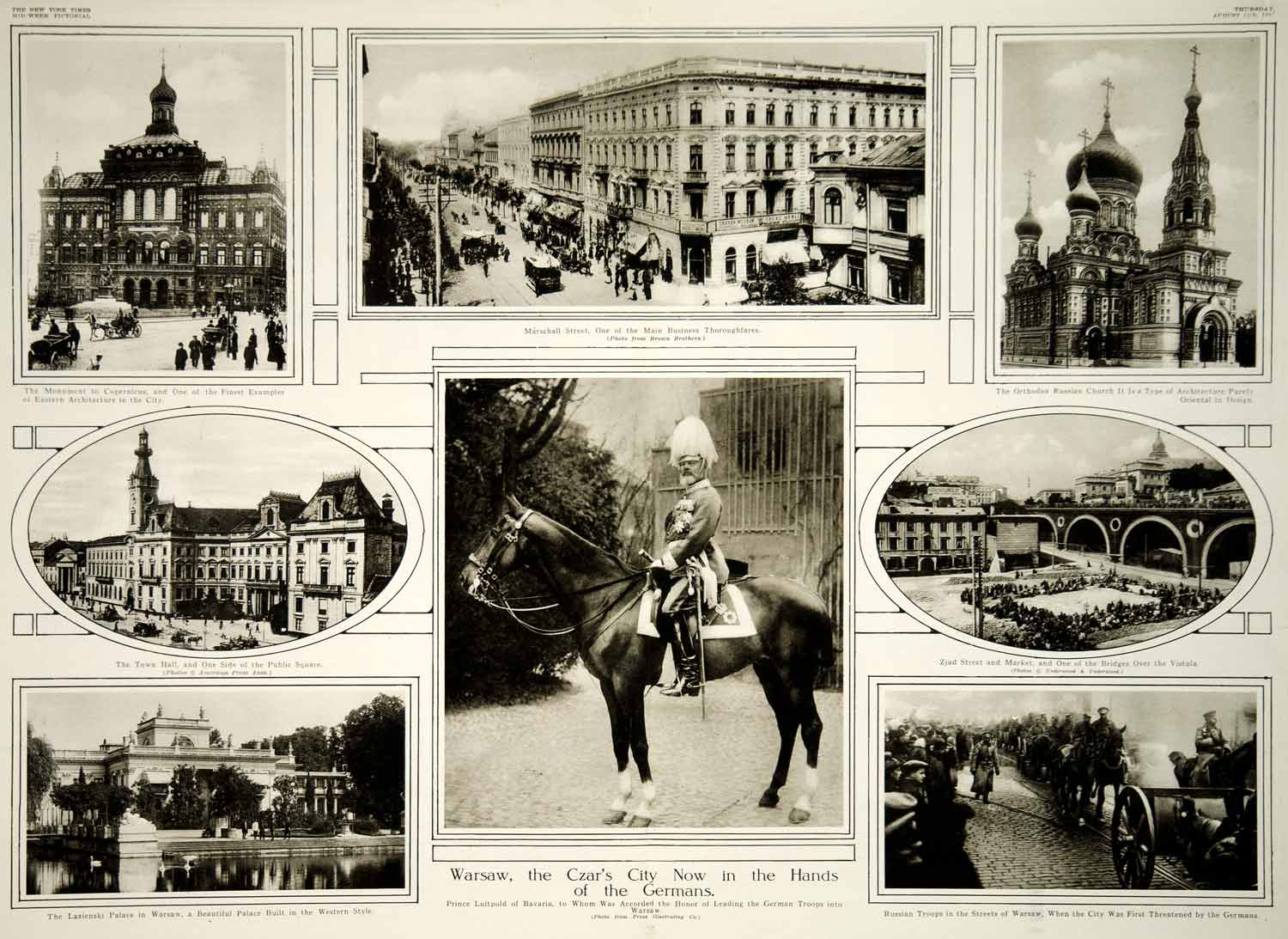 This is an original 1915 large-format duotone rotogravure with images of the city of Warsaw, Poland during World War I. The city was occupied by German troops from 4 August 1915 until November 1918.