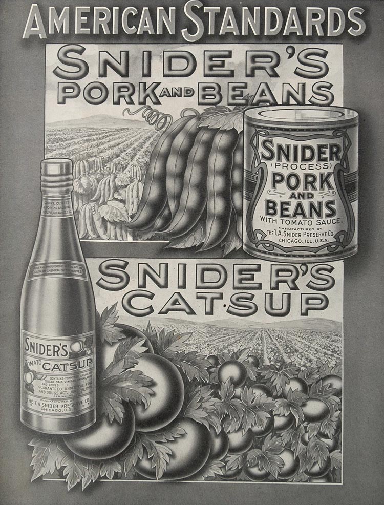 This is an original 1915 black and white print ad for Snider's Pork and Beans and Snider's Catsup.