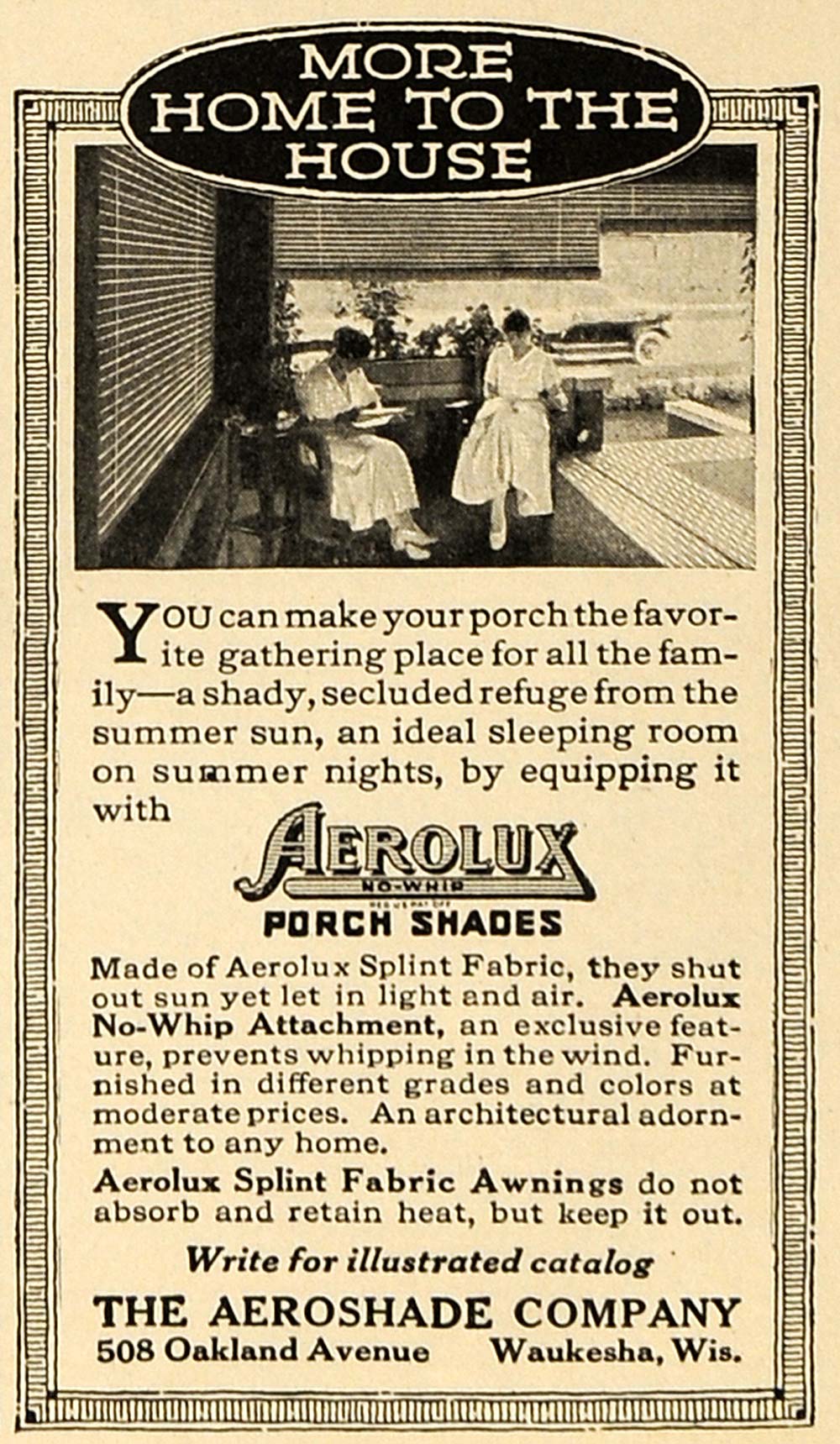 This is an original 1916 black and white print ad for The Aeroshade Company of Waukesha, Wisconsin. The ad writes, "You can make your porch the favorite gathering place for all family-- a shady, secluded refuge from the summer sun, an ideal sleeping room on summer nights, by equipping it with Aerolux Porch Shades".