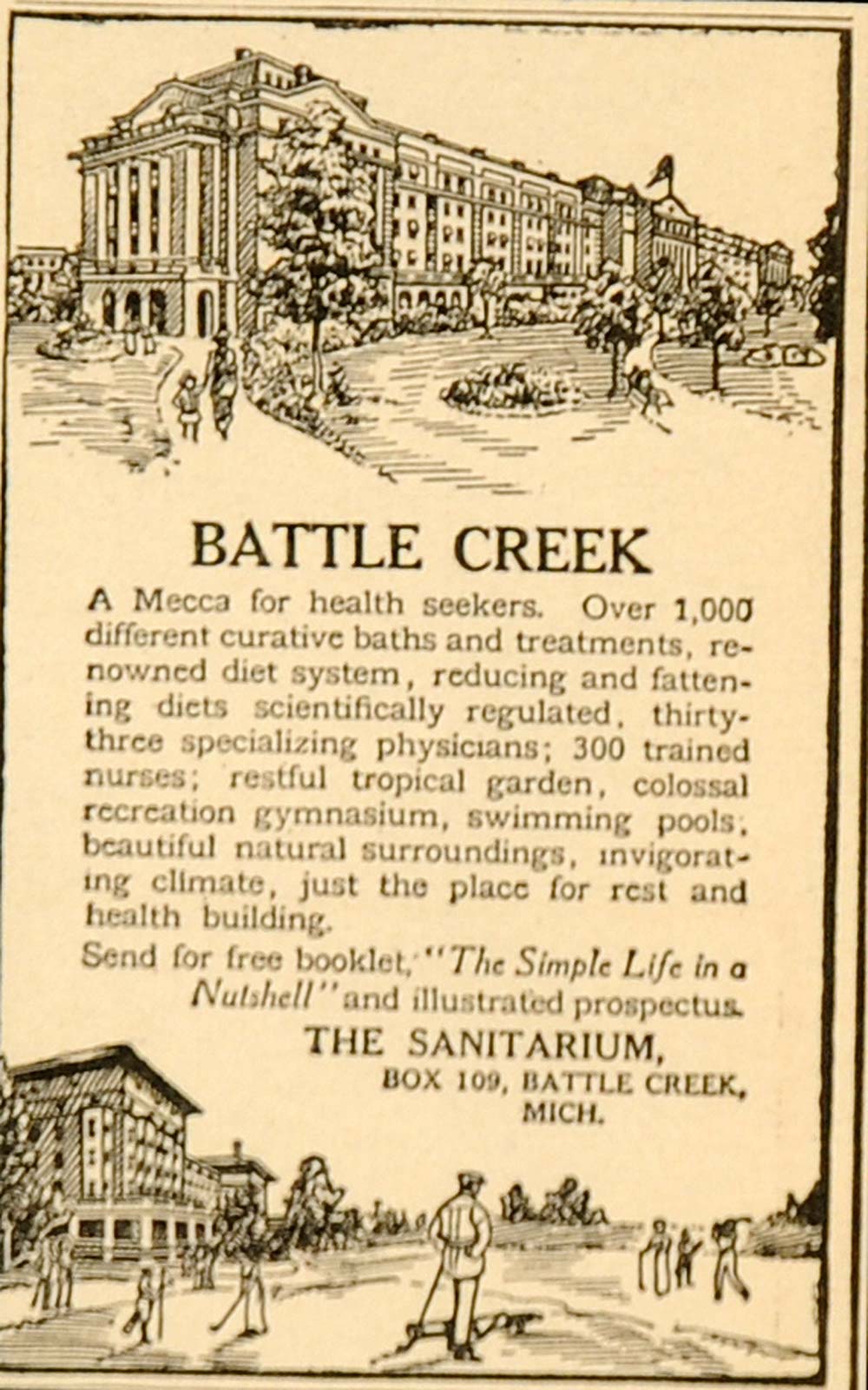 This is an original 1916 black and white print ad for the Battle Creek Sanitarium "a Mecca for health seekers" in Battle Creek, Michigan.