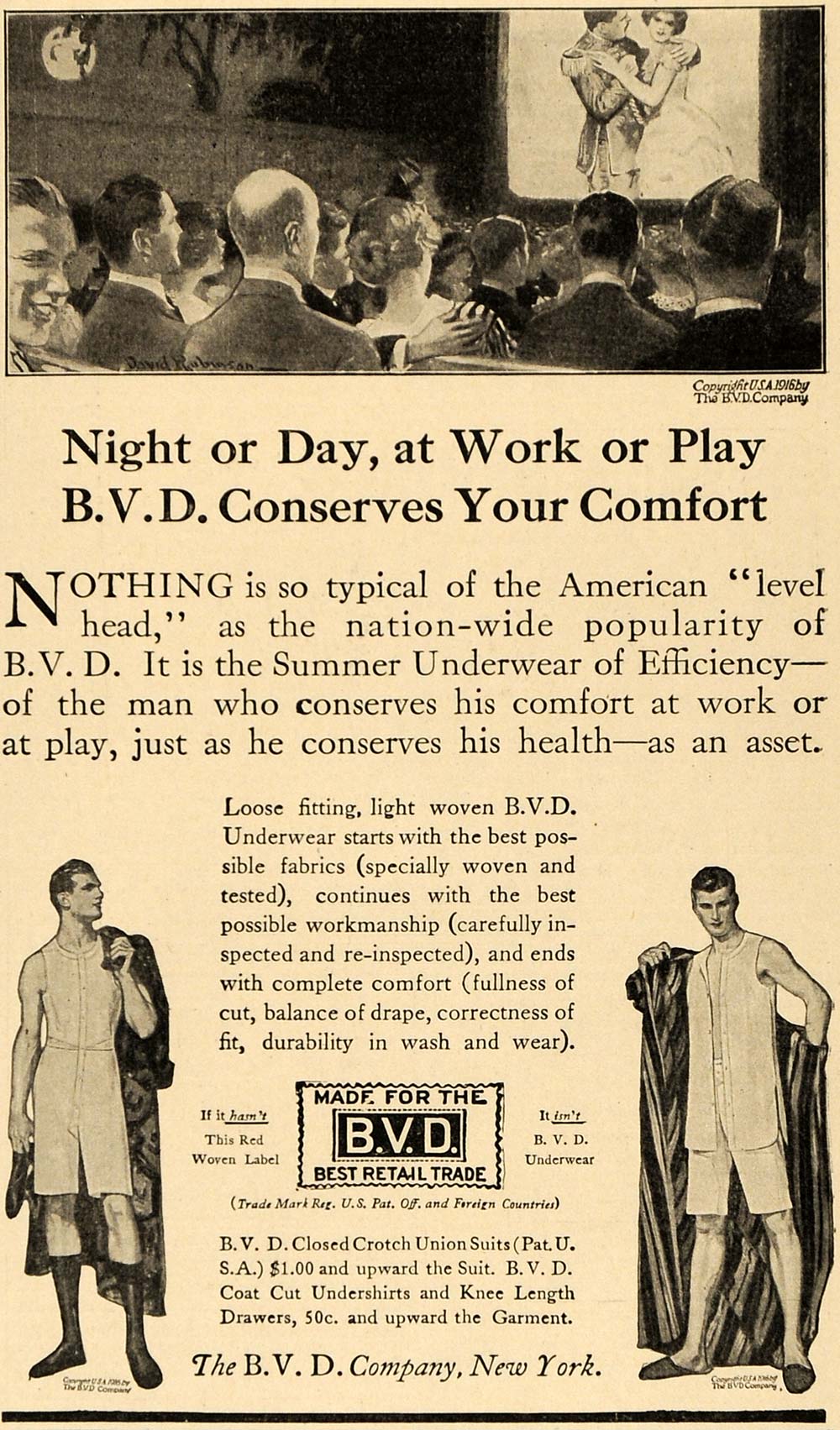 This is an original 1916 black and white print ad for closed crotch union suits, knee length drawers, undershirts, underwear and other clothing by The B. V. D. Company in New York.