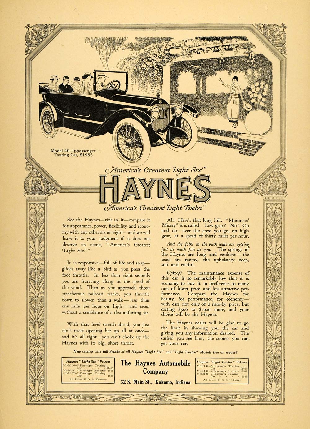 This is an original World War I 1916 black and white print ad for the Haynes Greatest Light Six and Light Twelve automobiles, specially featuring the Model 40 5-Passenger Touring Car.