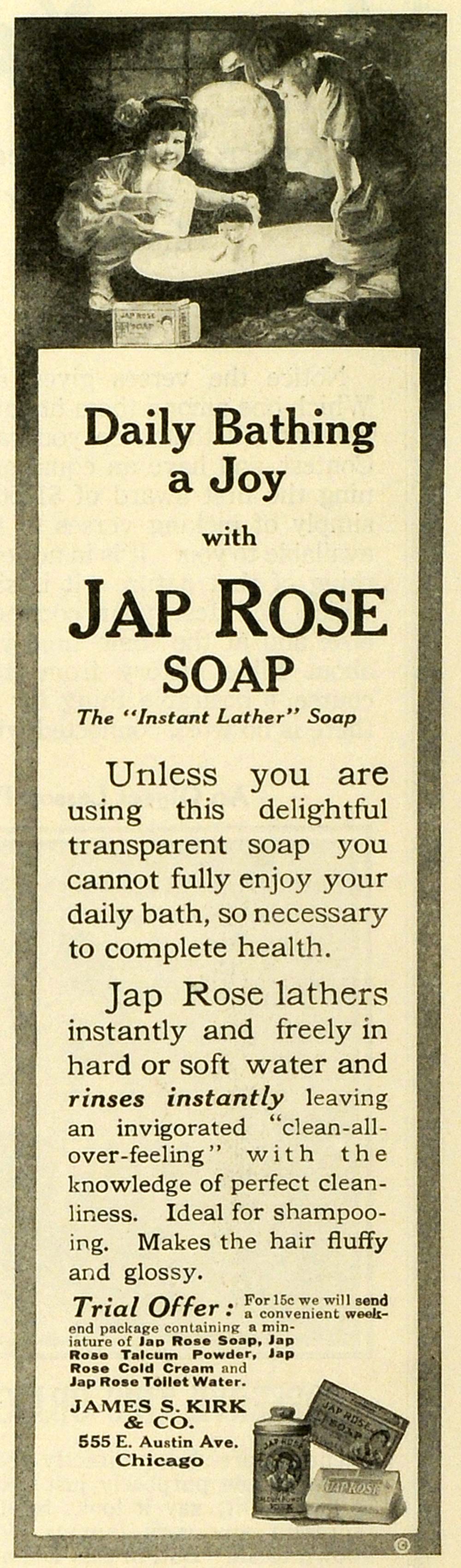 This is an original 1916 black and white print ad for the Jap Rose Soap from James S. Kirk & Company located at 555 East Austin Avenue, Chicago, Illinois.