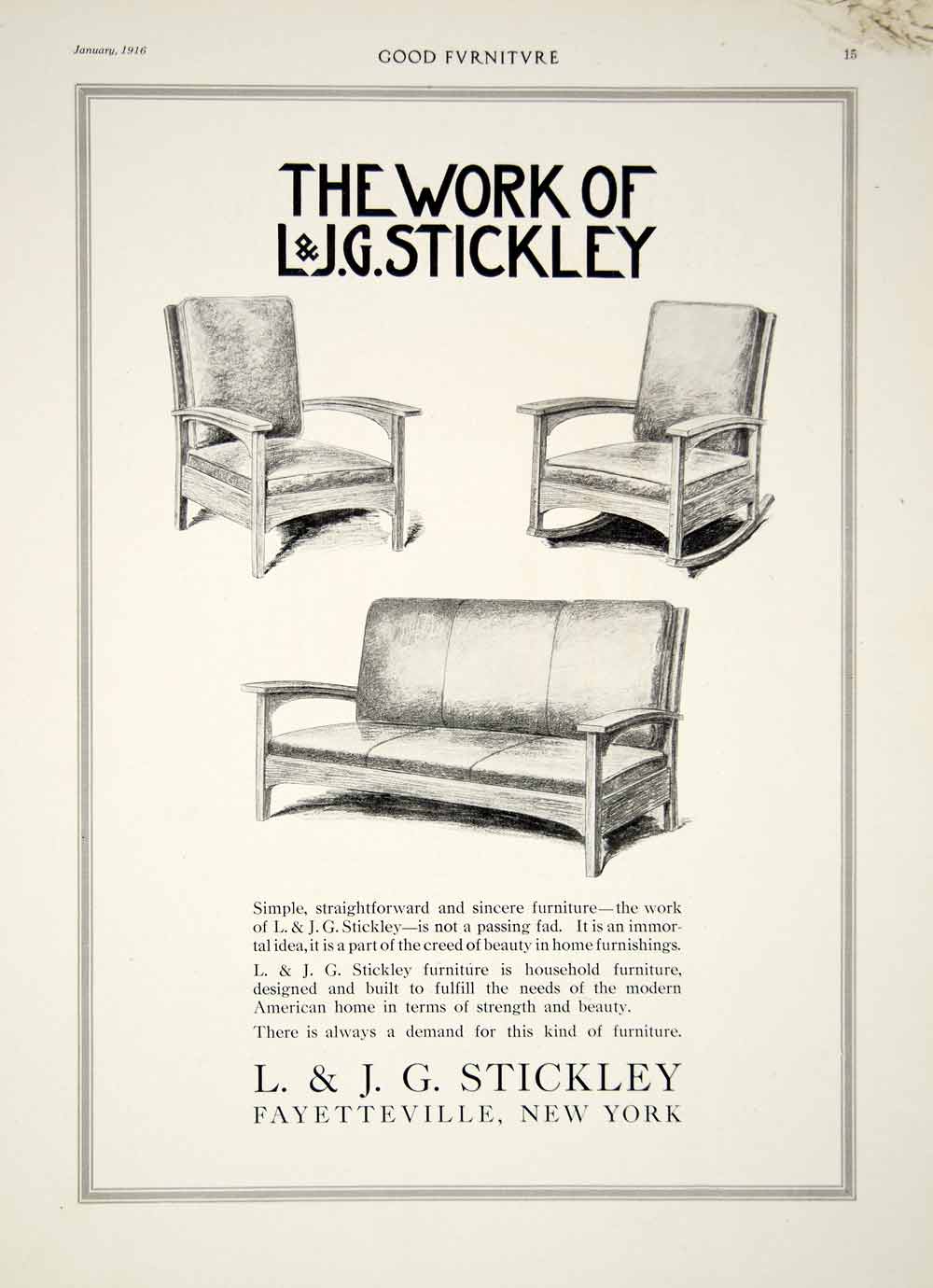 This is an original 1916 black and white print ad for furniture from L. & J. G. Stickey of Fayetteville, NY.