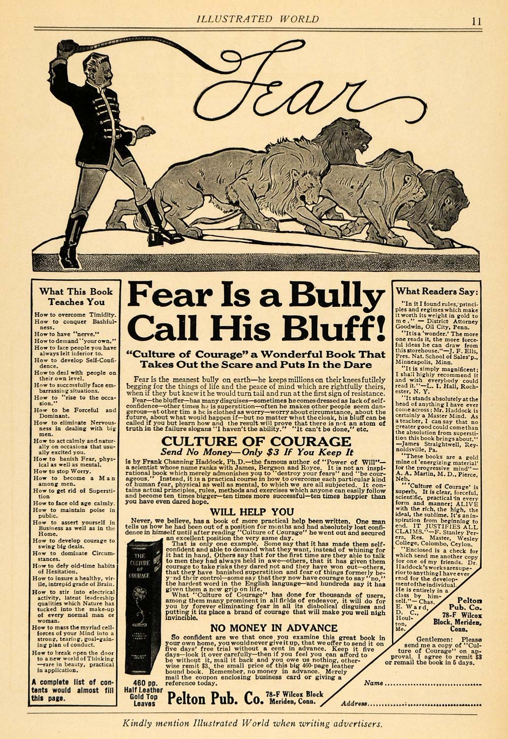 This is an original 1916 black and white print ad for the book, "Culture of Courage", by Frank Haddock, from the Pelton Pub. Company of Meriden, Connecticut. The ad writes, "How to overcome timidity. How to conquer bashfulness. How to have nerve. How to demand your own. How to face people you have always felt inferior to..." The ad features quotes from District Attorney Goodwin, J. F. Ells, L. I. Hall, James Straightwell, A. A. Martin, D. Houlton, and F. Stanley Perera.