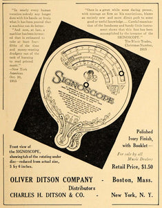 This is an original 1916 black and white print ad for the Signoscope by the Oliver Ditson Company of Boston, Massachusetts and distributed by Charles H. Ditson & Company of New York City.