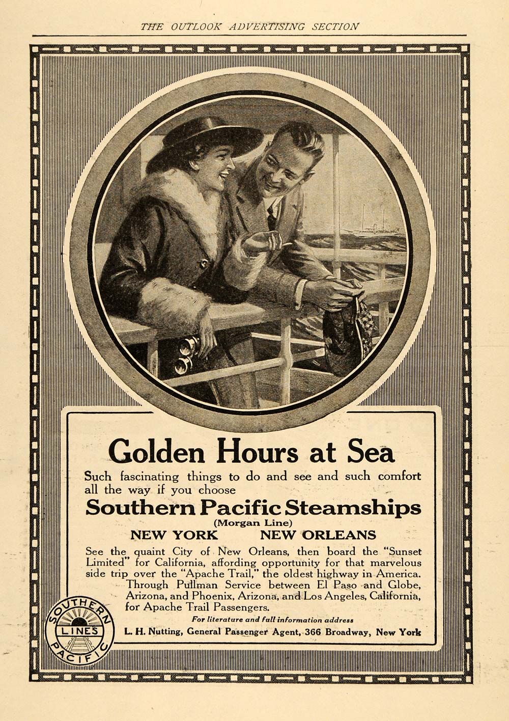 This is an original 1916 black and white print ad for Southern Pacific Steamships. The image shows a couple having a conversation on the deck of the ship.