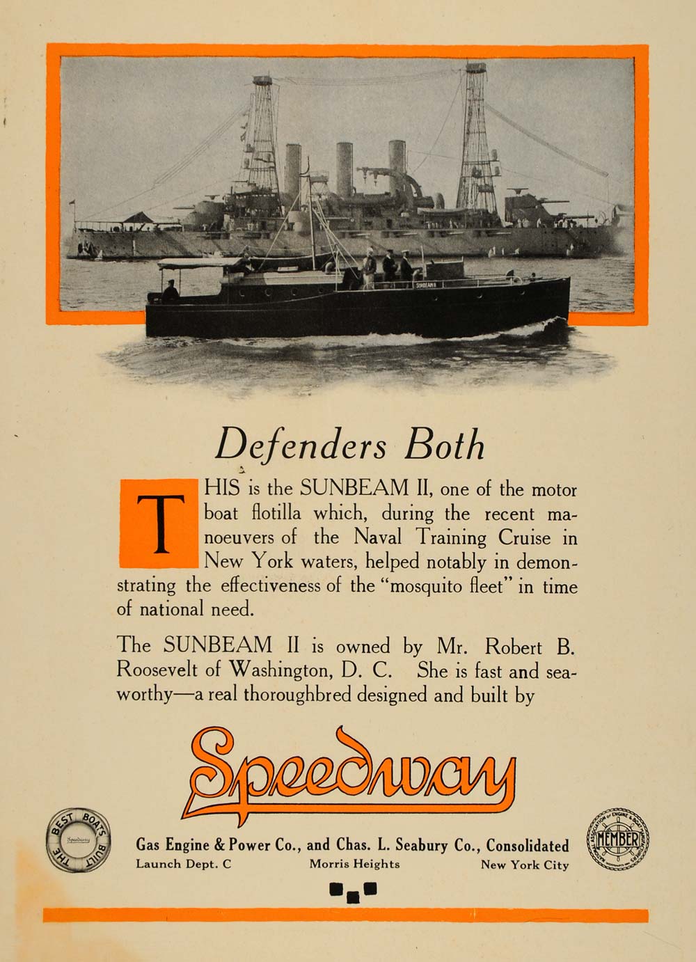 This is an original 1916 color print ad for the Speedway Gas Engine & Power Company, and Chas. L. Seabury Company, Consolidated, located at the Launch Dept. C in Morris Heights, New York City. This ad features the Sunbeam II, a boat owned by Mr. Robert B. Roosevelt of Washington, D. C.