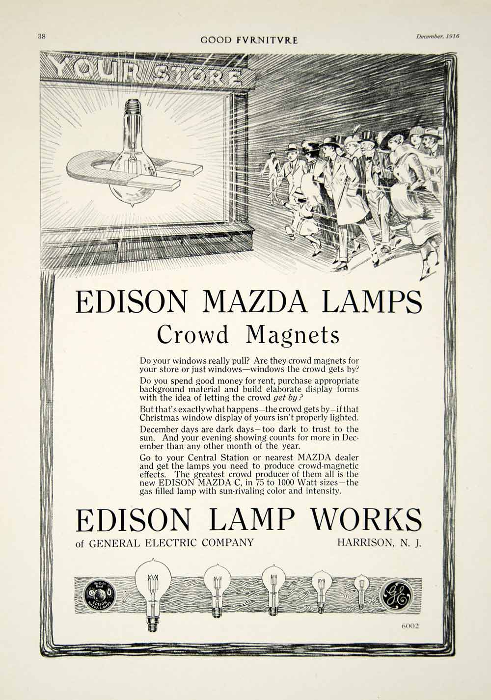 This is an original 1916 black and white print ad for Mazda C light bulbs from the Edison Lamp Works of General Electric Company, Harrison, NJ.
