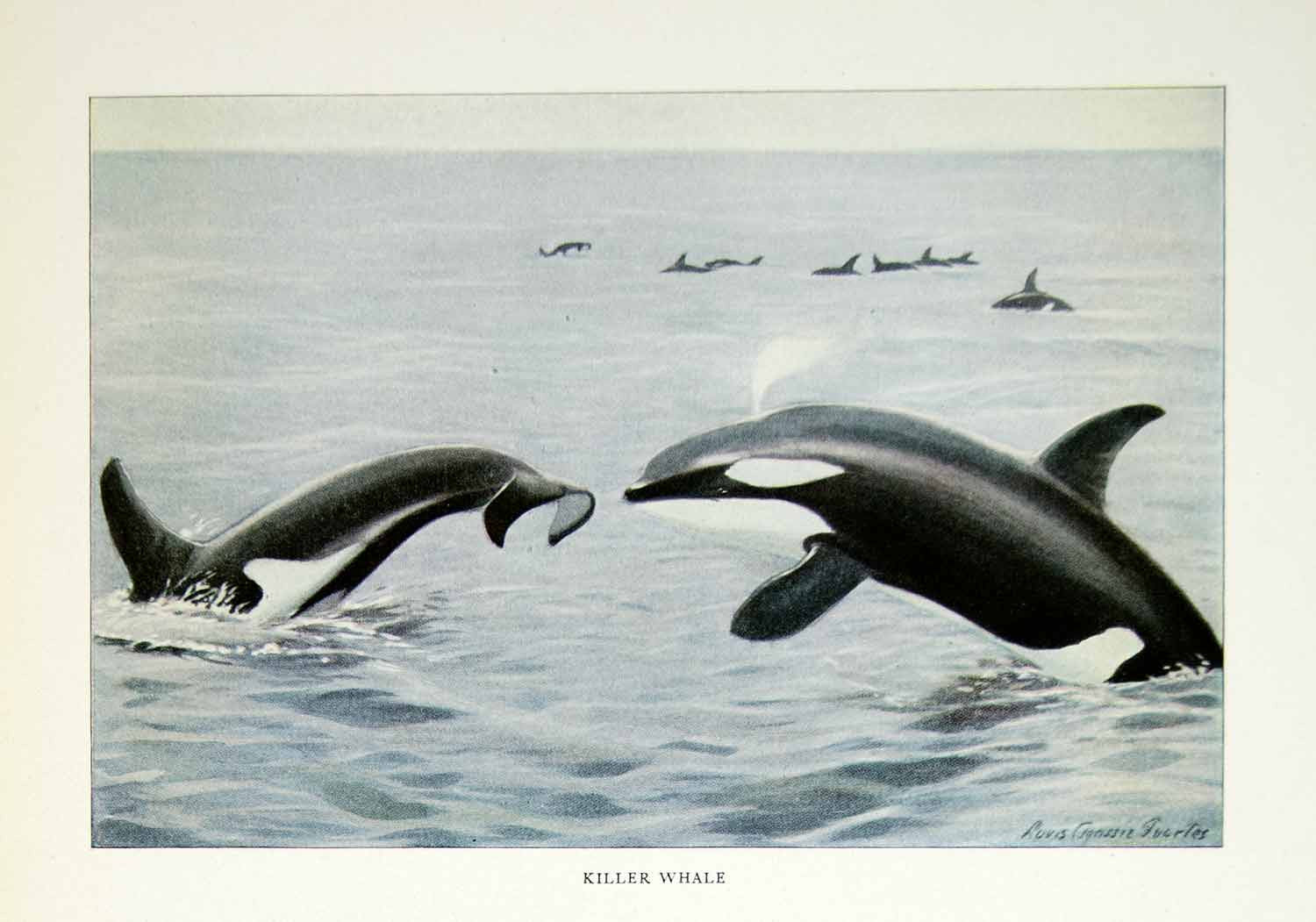 This is an original 1916 color print of a group of Killer Whales by Louis Agassiz Fuertes.