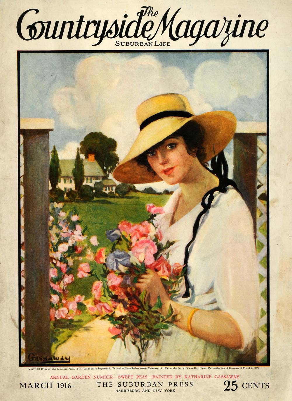 This is an original 1916 color cover for The Countryside Magazine for March from Suburban Press of Harrisburg, Pennsylvania, and New York. The artwork on this cover is entitled "Sweet Peas".CONDITION