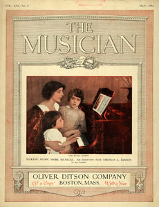 This is an original 1916 color cover for The Musician Magazine for May (Volume XXI, No. 5) from the Oliver Ditson Company of Boston, Massachusetts. This cover features an image of two children learning the piano and the text describes an article interview with Thomas A. Edison.CONDITION