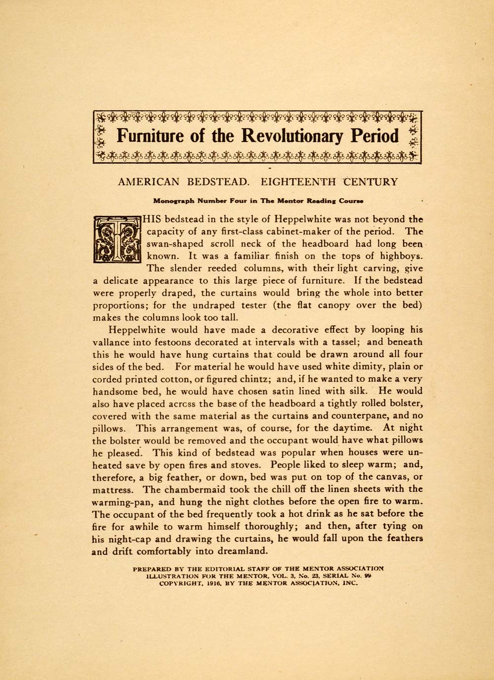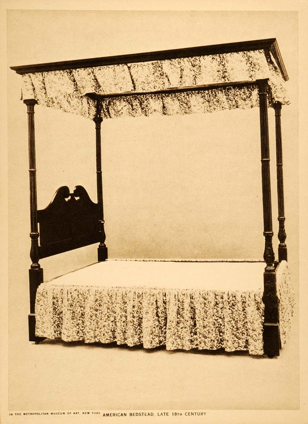 This is an original 1916 photogravure of an American bedstead dating from the 18th century in the style of George Hepplewhite. On the reverse is a short article about this bed. Please see both images.