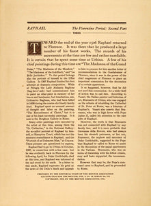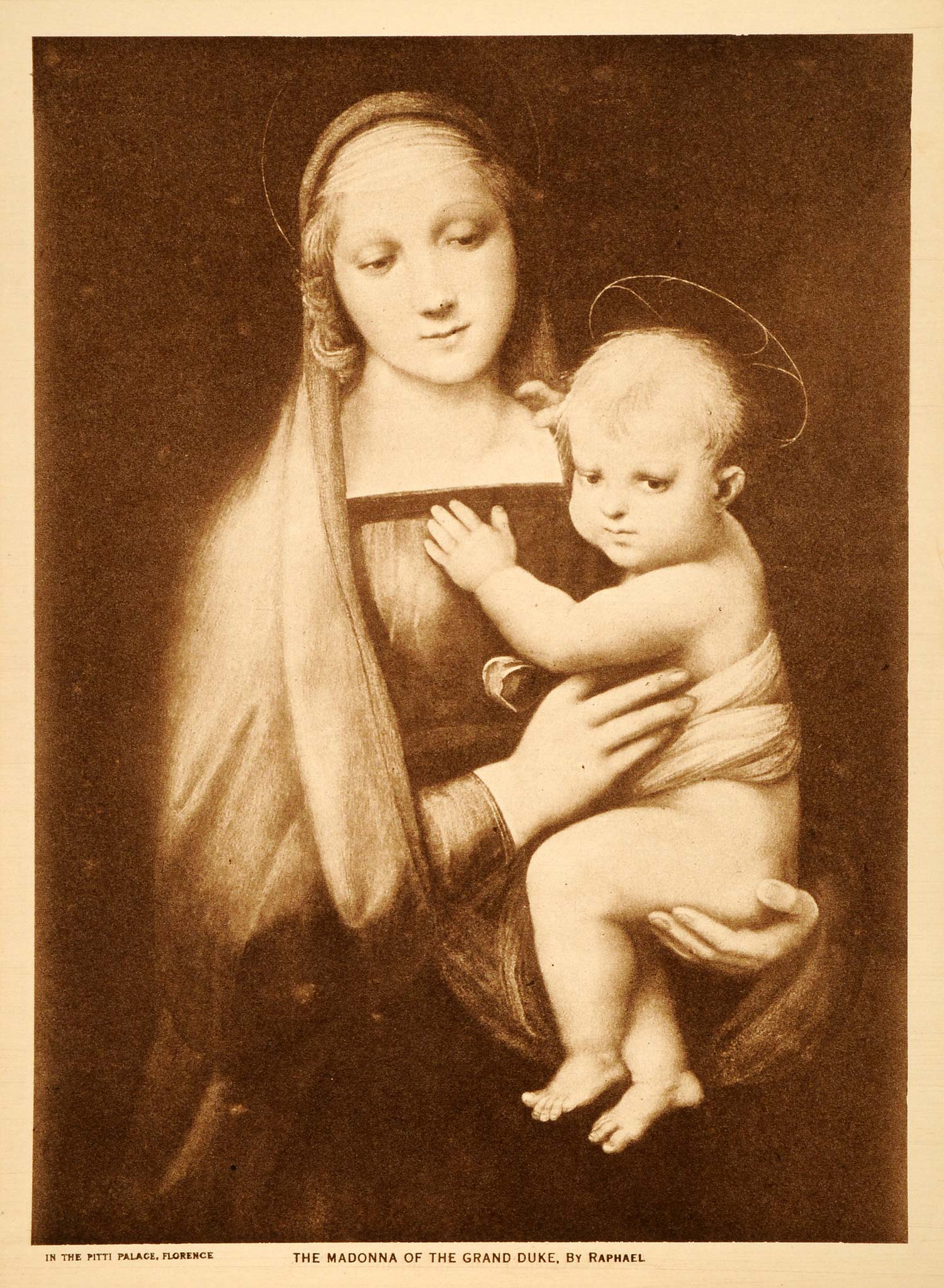 This is an original 1916 photogravure of a painting by Raphael, "Madonna of the Grand Duke" or "Madonna del Granduca." On the reverse is a short biographical sketch about Raphael during his Florentine period. Please see both images.
