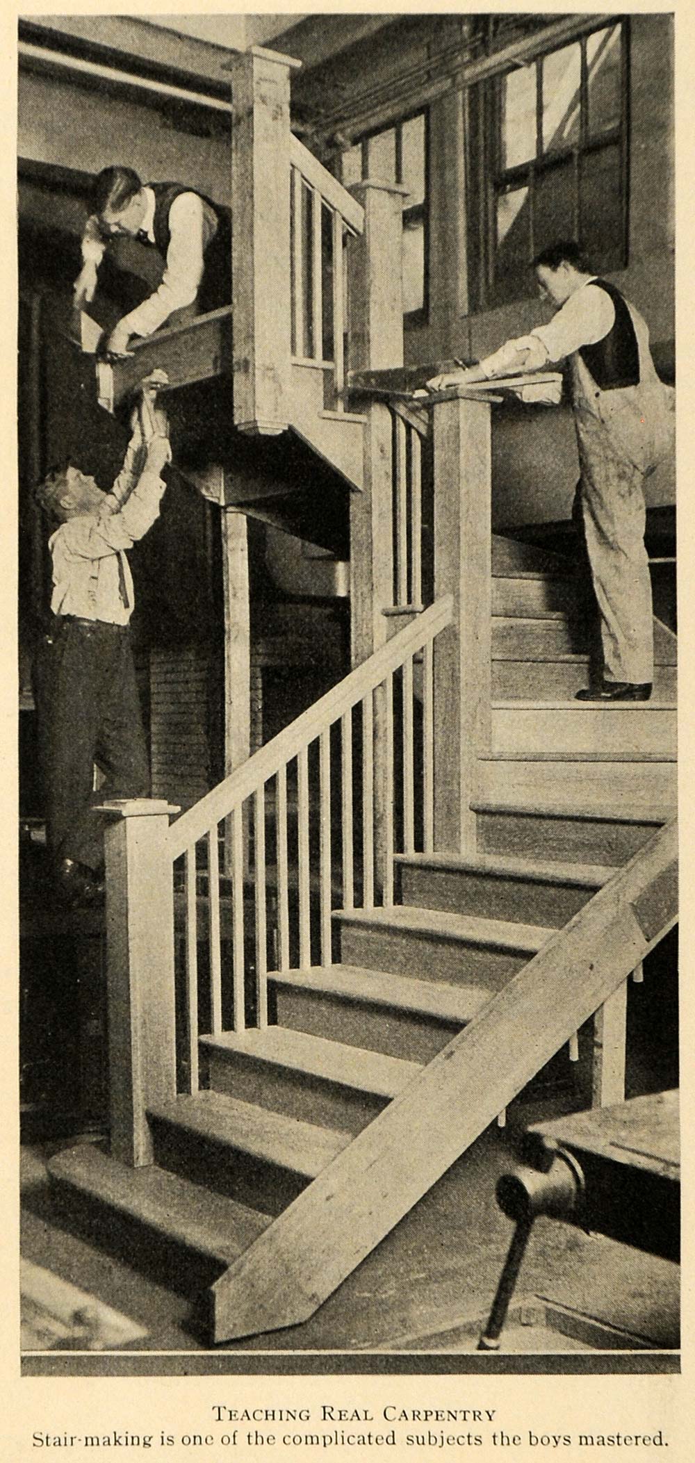 This is an original 1916 halftone print of three men working on a staircase. The ad writes, "Stair making is one of the complicated subjects the boys mastered."