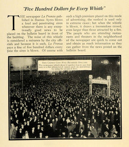 La Prenza newspaper in Buenos Aires; this newspaper toots a whistle whenever there is unusual news to be heard.