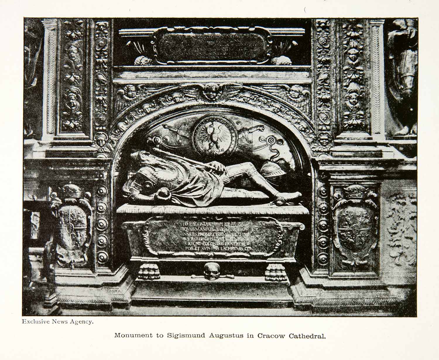 This is an original 1916 black and white halftone print of the monument to Sigismund Augustus, located in the Krakow Cathedral. Sigismund II Augustus was the King of Poland, as well as the Grand Duke of Lithuania.